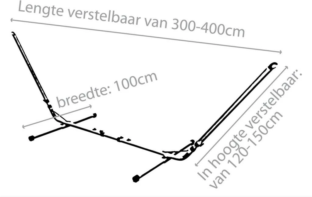 Ein robustes Hängemattengestell. Ein Stahlrahmen, der an einer Hängematte befestigt werden soll einschließlich Metallhaken. Da der Rahmen sowohl in der Länge als auch in der Höhe einstellbar ist, passt fast jede Hängematte. Geeignet für Hängematten mit einer Gesamtlänge von 285 bis 385 Zentimetern. Die Höhe ist von 105 bis 135 Zentimeter einstellbar. Die Gesamtmaße des Rahmens betragen (L x B x H): 400 x 150 Zentimeter. Maximale Tragfähigkeit: 150 Kilogramm. Maximale Tragfähigkeit: 150 Kilogramm.