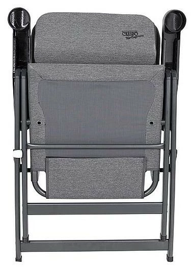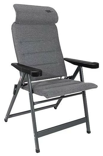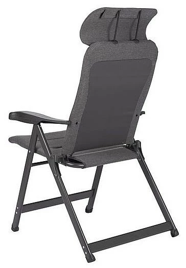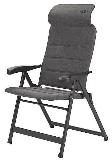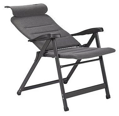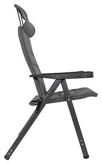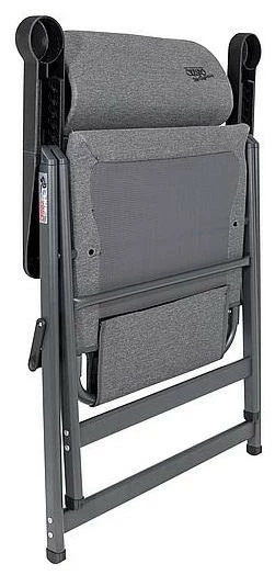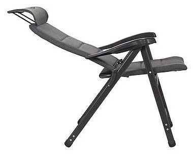 Ein sehr luxuriöser, kompakter und verstellbarer Stuhl. Dieser Stuhl bietet dank der siebenfach verstellbaren Rückenlehne und der stufenlos einstellbaren Kopfstütze maximalen Komfort. Die komfortable und besonders hochwertige Polsterung des Stoffs ist UV-beständig, besonders luftdurchlässig und hält, aufgrund der offenen Zellstruktur, keine Feuchtigkeit zurück. Dadurch ist das Gewebe besonders pflegeleicht und trocknet deutlich schneller als bei Stühlen mit herkömmlicher Schaumstoffpolsterung. Zudem sind Rückenlehne, Sitzfläche und Armlehnen ergonomisch geformt. Der Stuhl ist mit einem eloxierten H-Rahmen ausgestattet, der extra Stabilität und Sicherheit gewährleistet. Der Stuhl ist im eingeklappten Zustand nur 8 cm dick, sehr kompakt und dadurch einfach zu transportieren.