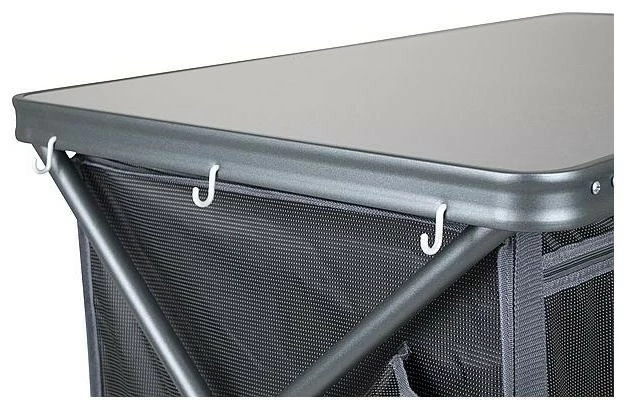 Een zeer stabiel en stevig kookeiland. Zeer eenvoudig op te zetten door een uniek systeem voor het in- en uitklappen van deze kast! Deze kook-/legkast beschikt over een grijs oplegblad van melamine. Waardoor het hittebestendig en watervast is. De aluminium behuizing is stijlvol zwart. De hoes is gemaakt van extra stevig 400 denier polyester met daarin 4 handige legplanken, aan de zijkant 4 vakken en een mesh raam aan de achterkant. De verstelbare poten met stabilisatoren zijn afzonderlijk af te stellen zodat de legkast op iedere ondergrond stabiel staat. De kast wordt geleverd in een draagtas.