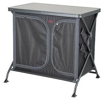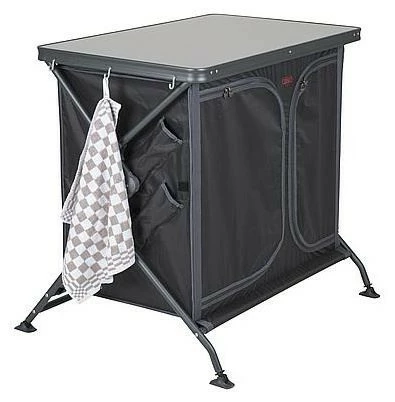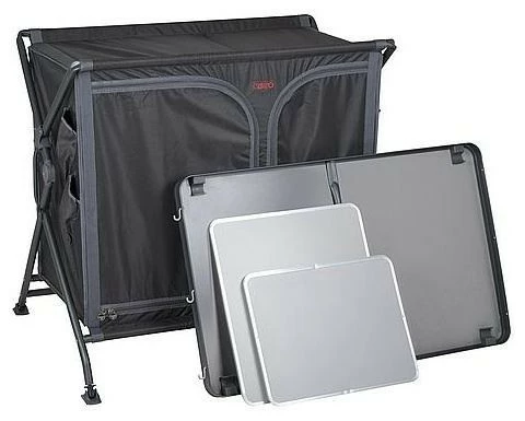 Eine sehr stabile und robuste Campingküche. Durch das einzigartige Schnellaufbausystem ist dieser Schrank sehr einfach aufzustellen! Dieser Koch-/Aufbewahrungsschrank hat eine Arbeitsplatte aus grauem Melamin. Dadurch ist er hitzebeständig und wasserfest. Das Aluminiumgehäuse ist in stilvollem Schwarz gehalten. Die Hülle besteht aus extra stabilem 400D Polyester mit 4 praktischen Einlegeböden, 4 Seitentaschen und einem Netzfenster auf der Rückseite. Die verstellbaren Beine mit Stabilisatoren sind unabhängig voneinander einstellbar, so dass der Schrank auf jedem Untergrund stabil steht. Der Schrank wird in einer Tragetasche geliefert.