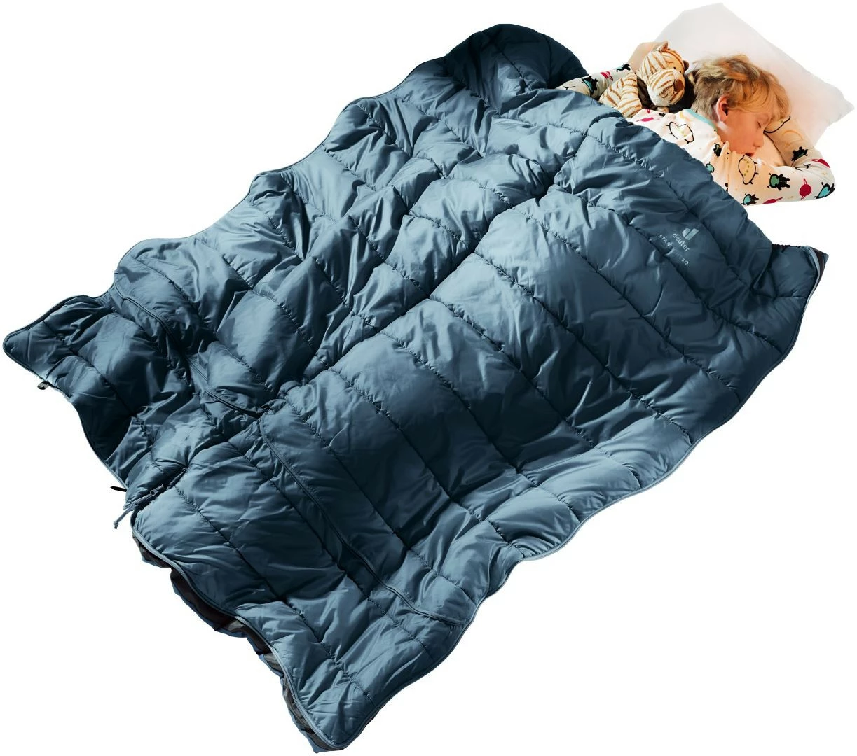Der unempfindliche Kinder-Schlafsack mit viel Beinfreiheit wird im VW-Bus oder Wohnmobil bei Bedarf auch ganz schnell zur Decke. Und wenn die Kinder älter werden, wächst er am Fußende um 30 cm mit.