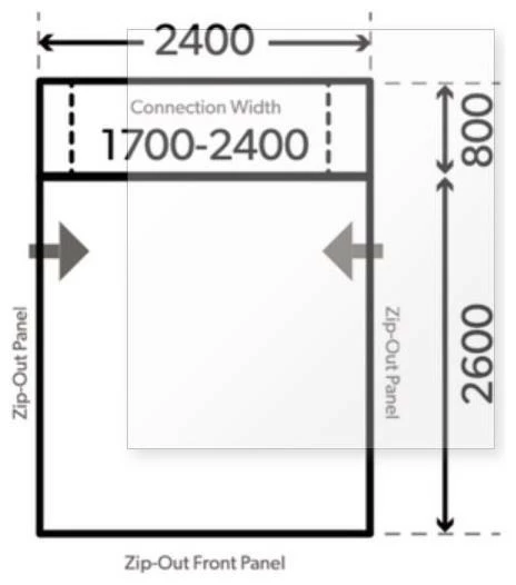 Speziell für umgebaute Kastenwagen mit Heckklappe entwickelt, einfach Türen öffnen und den Wohnbereich in das Vorzelt übergehen lassen. Die stufenlos verstellbare Verbindungsschleuse kann schnell abgekoppelt und an Ort und Stelle belassen werden, während Sie die Umgebung erkunden.