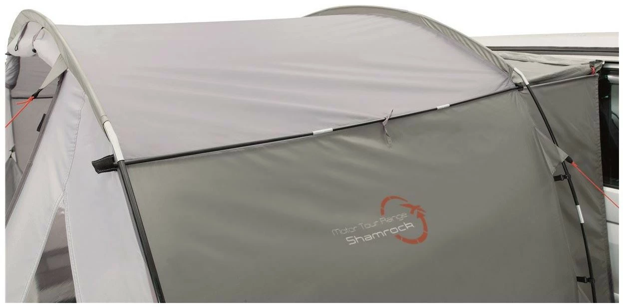 A versatile drive-away awning, Shamrock has pre-angled fibreglass poles plus exterior fiberglass poles for stability and tent fabric tension. With full standing headroom, curtained windows, a large front door that can be set up as extra shelter, large rear door, side air vents and full-size toggle-up groundsheet, its ideal for extended touring..