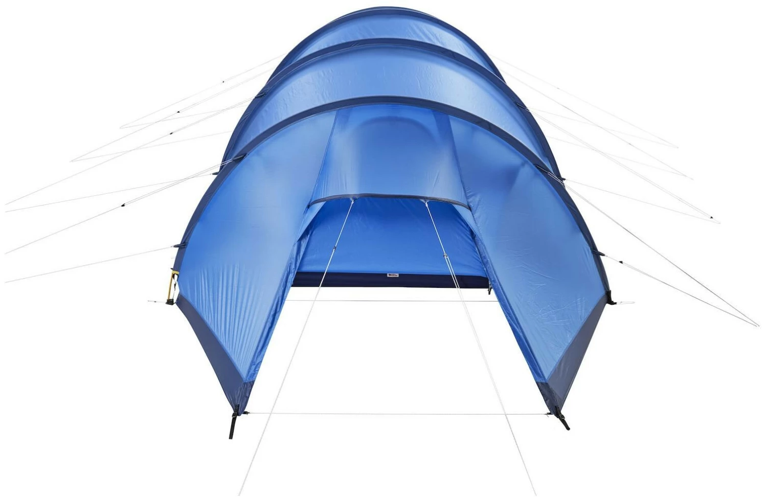De grote leefruimte heeft veel opbergruimte en ruimte om maaltijden te bereiden. De ingang zit aan de zijkant zodat het gemakkelijk is om de ruimte goed te benutten. Een tweede leefruimte aan het uiteinde van de tent zorgt niet alleen voor extra opbergruimte, maar ook voor in- en uitloopgemak wanneer je met meer personen bent. In de grote leefruimte en in de binnentent is een drooglijn aanwezig. Bovendien heeft de binnentent praktische mesh vakken voor opberggemak. De binnen- en buitentent worden tegelijk opgezet. De tentsleuven hebben een kleurcodering en zijn zo breed dat er dubbele tentstokken (een accessoire) in passen voor extreme omstandigheden. Grote, goed gepositioneerde ventilatieopeningen zorgen voor een optimale luchtcirculatie. Alle openingen zijn afgedekt met een fijn gaas dat zelfs de kleinste, nauwelijks zichtbare, insecten buitenhoudt. Bij warm weer kunnen de deuren halfopen gezet worden voor extra luchtcirculatie zonder dat er regen in de binnentent kan komen; de ritsen hebben een auto-lock-functie zodat de deuren niet door de wind omhoog kunnen kruipen. Bevestigingspunten voor Gear Loft (een accessoire) in de binnentent. De buitentent is gemaakt van het nieuwe high-performance TripleRip nylon van Fjällräven en heeft een innovatieve constructie, die twee verschillende stofdiktes combineert; 20 denier voor de bovenkant en 40 denier voor de onderkant waar de meeste slijtage plaatsvindt. Dit maakt de tent uitzonderlijk sterk ondanks zijn lage gewicht. * Net als alle tenten van Fjällräven is de Abisko Endurance 4 geheel zonder PVC en giftige vlamvertragers gemaakt. De impregnering is vrij van fluorkoolstoffen.