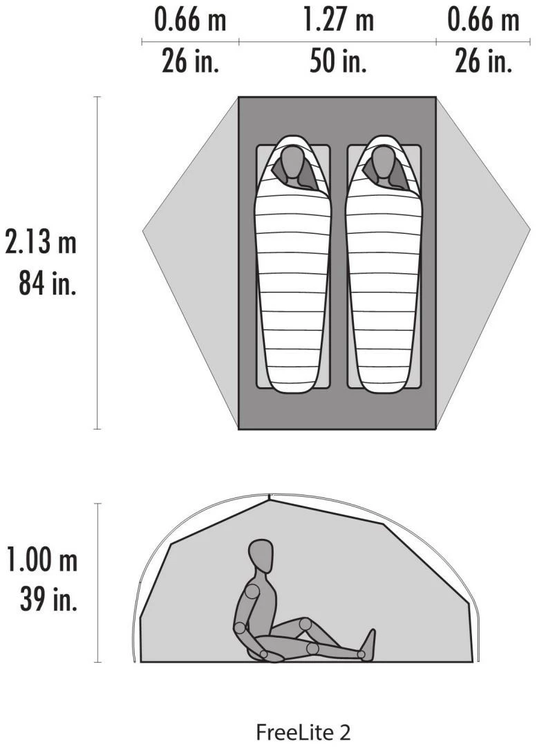 The Inside: 226 g (8 oz.) lighter than the previous FreeLite, it still has the true rectangular floor (no foot taper like most other tents) and one metre (39 in.) of headroom, 7.6 cm more than before.