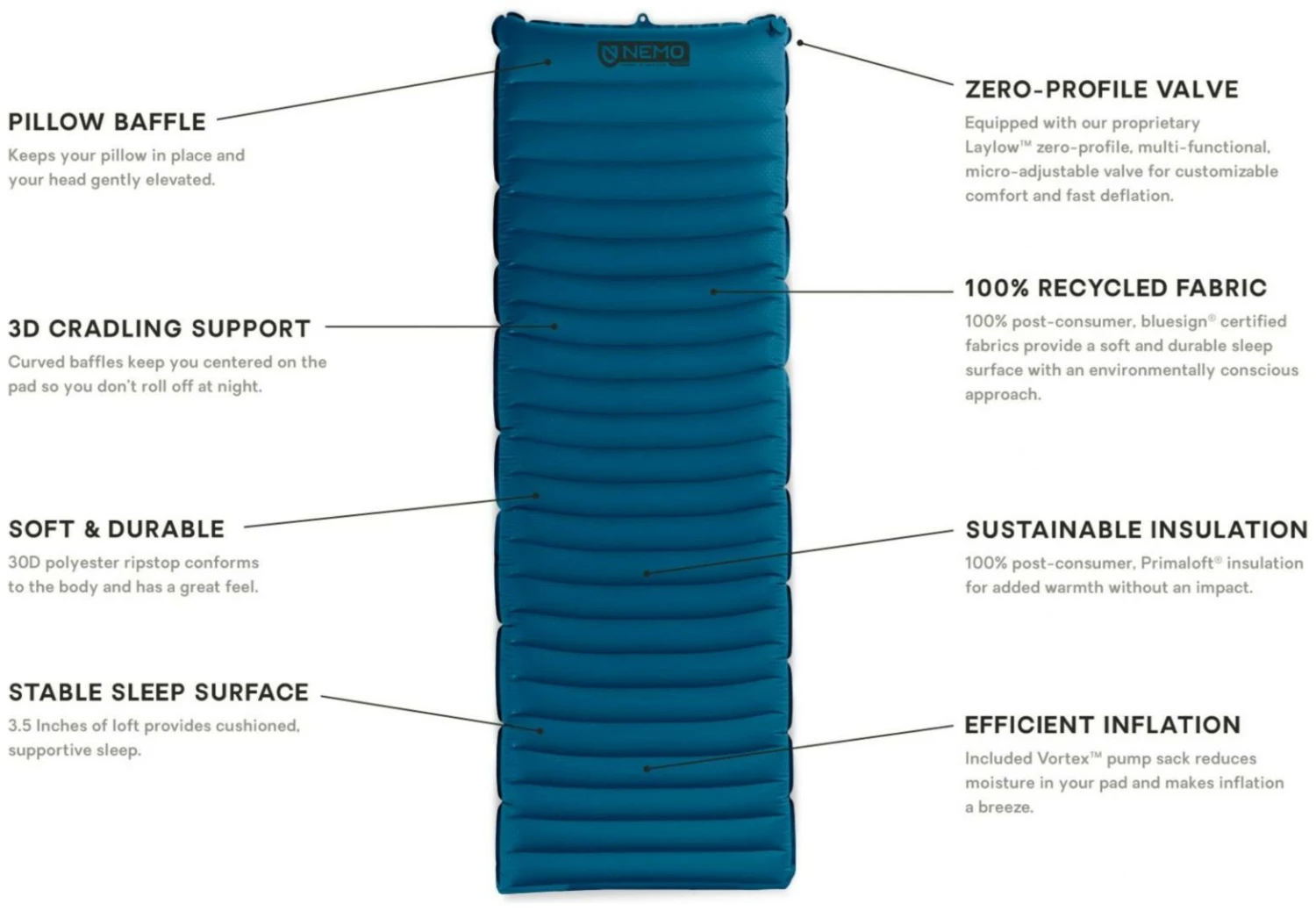 Newly added to the collection, this rising star utilizes our body-mapped 3D baffling to gently cradle and keep you centered on the pad during the night. The slightly elevated head baffle serves as a headboard, helping to keep your camp pillow in place. Packable, durable, and weight conscious, Quasar™ is a great versatile option for any adventure.