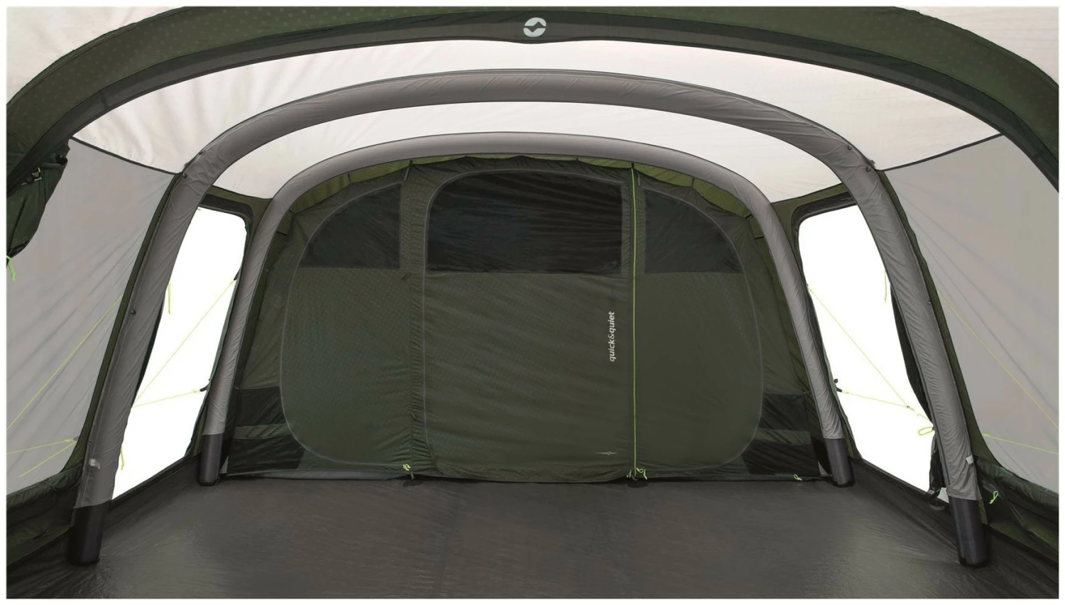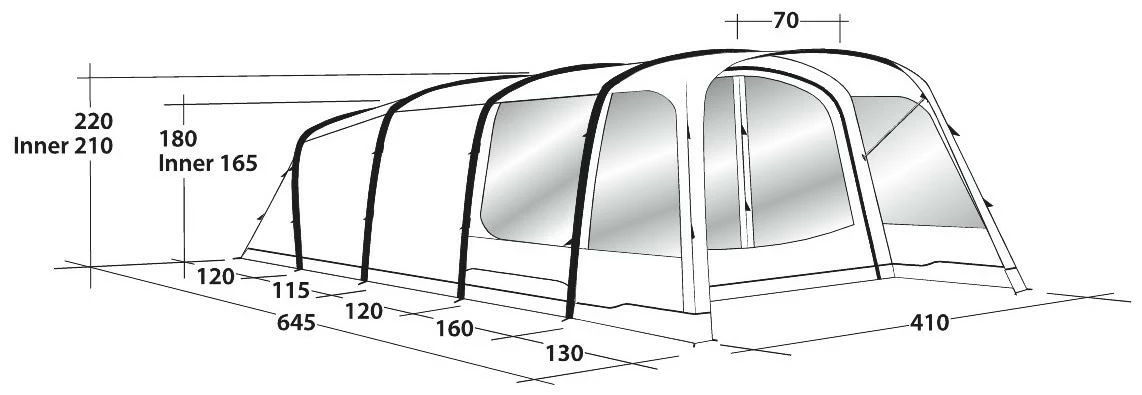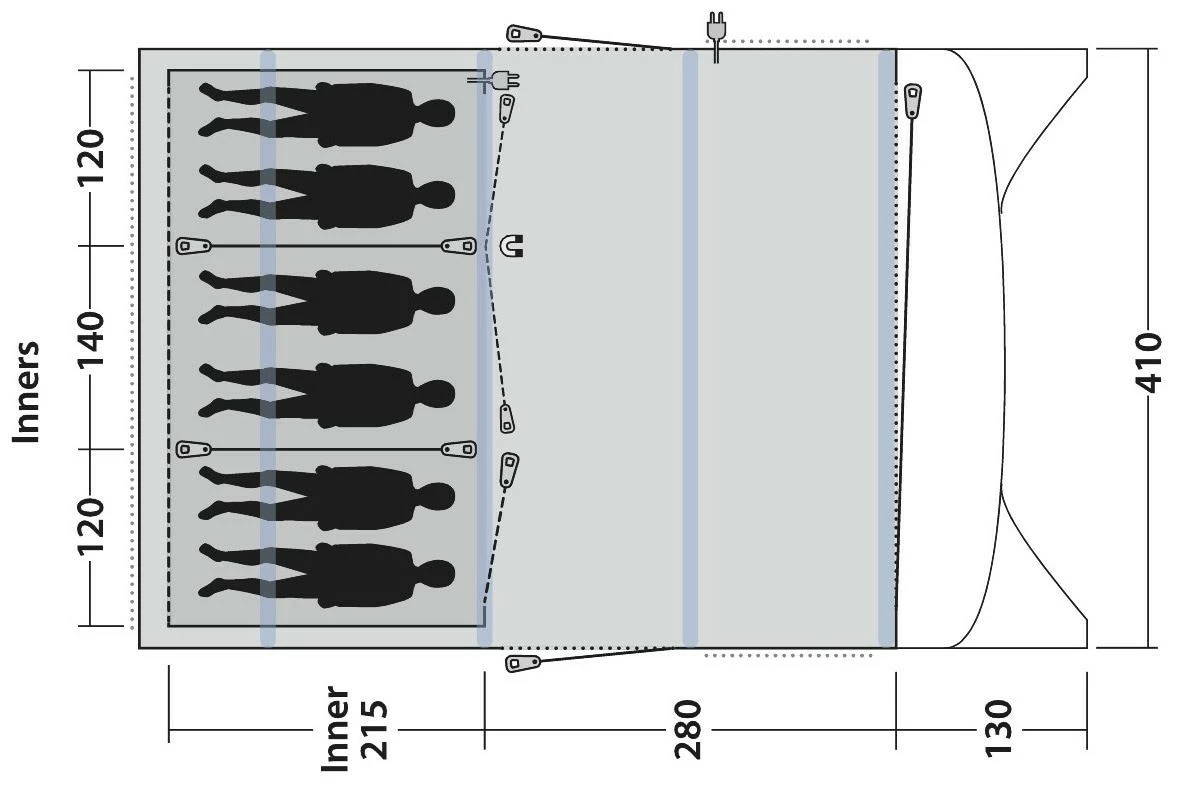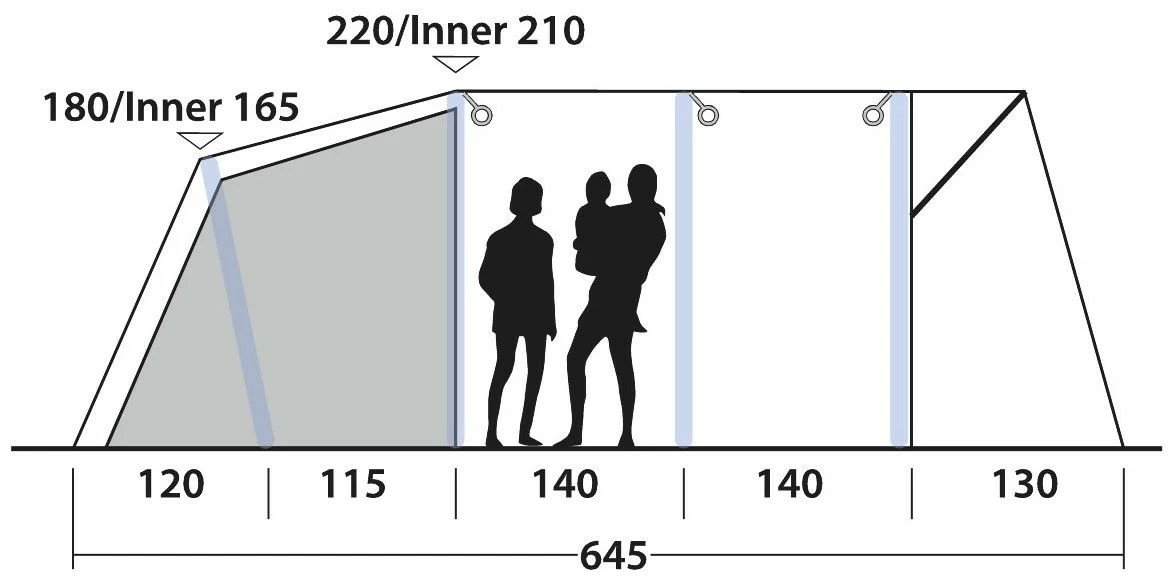 Een diepe luifel met grote zijramen boven de voorkant biedt uitstekende schaduw en beschutting bij het koken, eten of gewoon ontspannen in de frisse lucht. De tent biedt plaats aan zes personen in drie slaapkamers en dankzij de uitstekende ventilatiemogelijkheden kunt u de temperatuur, de sfeer en het comfort van uw tent eenvoudig naar wens regelen.
