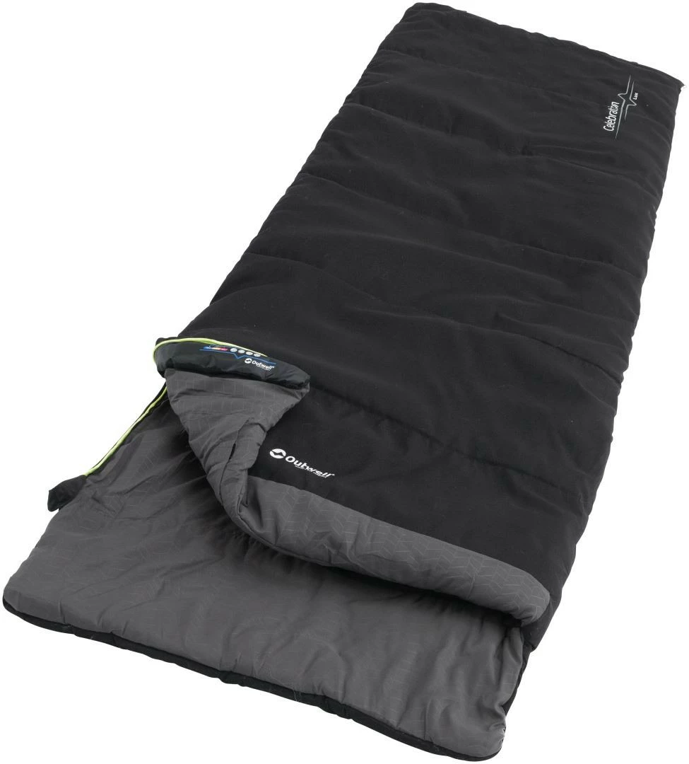 Look forward to going to bed in the cosy Outwell Celebration Lux Black sleeping bag. The super soft material feels wonderful next to the skin and the colour is a practical choice for holidays and festivals. Extra insulation makes it ideal for camping in and slightly out of season and theres a two-way zipper for easy ventilation on warmer nights.