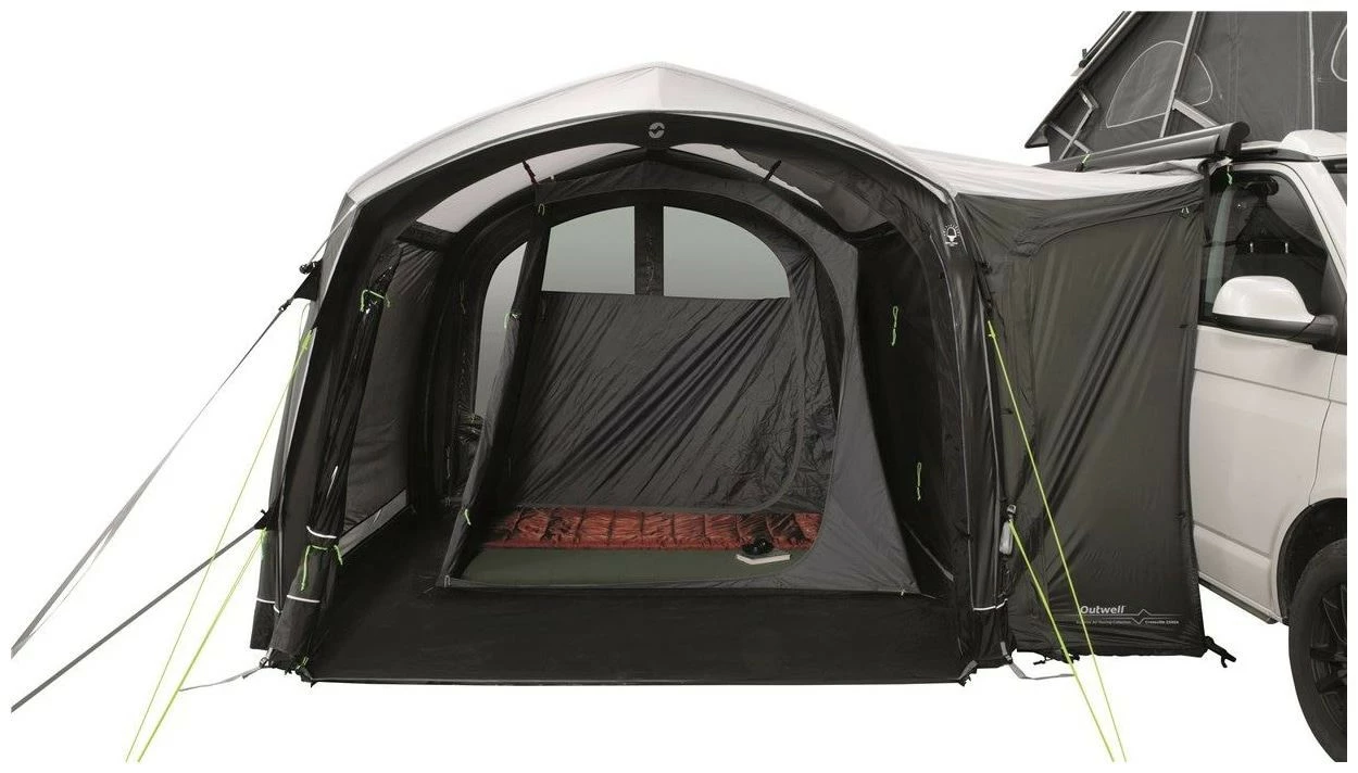 Paare und junge Familien werden das schlanke Design, die Stabilität der Luftschläuche und die praktische Vielseitigkeit der kompakten, parallel montierten, wegfahrenden Fahrzeugmarkise Outwell Crossville 250SA lieben. Regensichere Überdachungen über den Vorder- und Hintertüren bieten einfachen Zugang und viel geschützte Belüftung auch bei schlechtem Wetter. Sie können alle Türen öffnen, um sich als offener oder netzgedeckter Unterstand wirklich mit der Natur zu verbinden, und die eingenähte Bodenplane sorgt dafür, dass kriechende Käfer draußen bleiben. Vorbereitet für das Outwell Nightlight System (patentiert), das eine integrierte Beleuchtung innerhalb und außerhalb des Zeltes bietet, die von optionalen ONS-Leuchteinheiten-Sets betrieben wird.