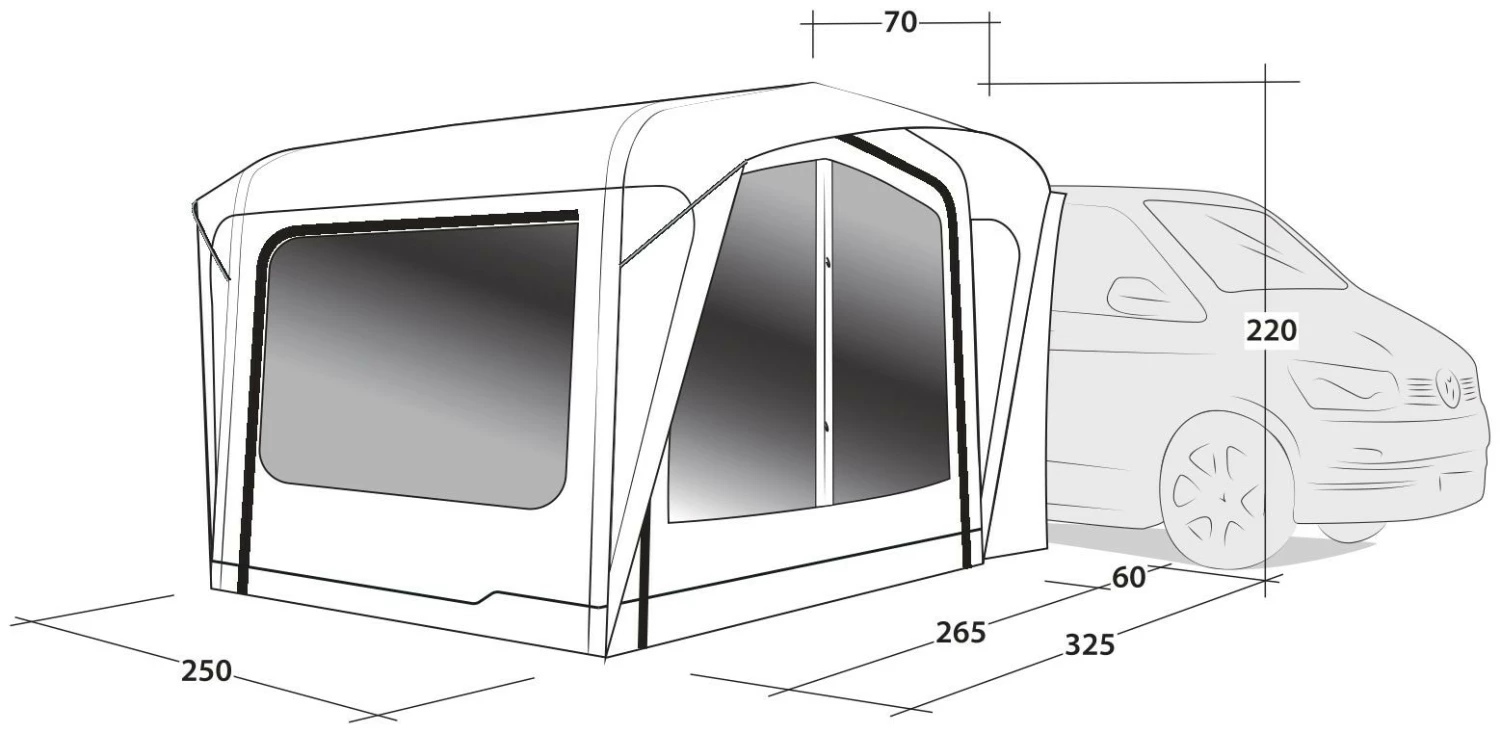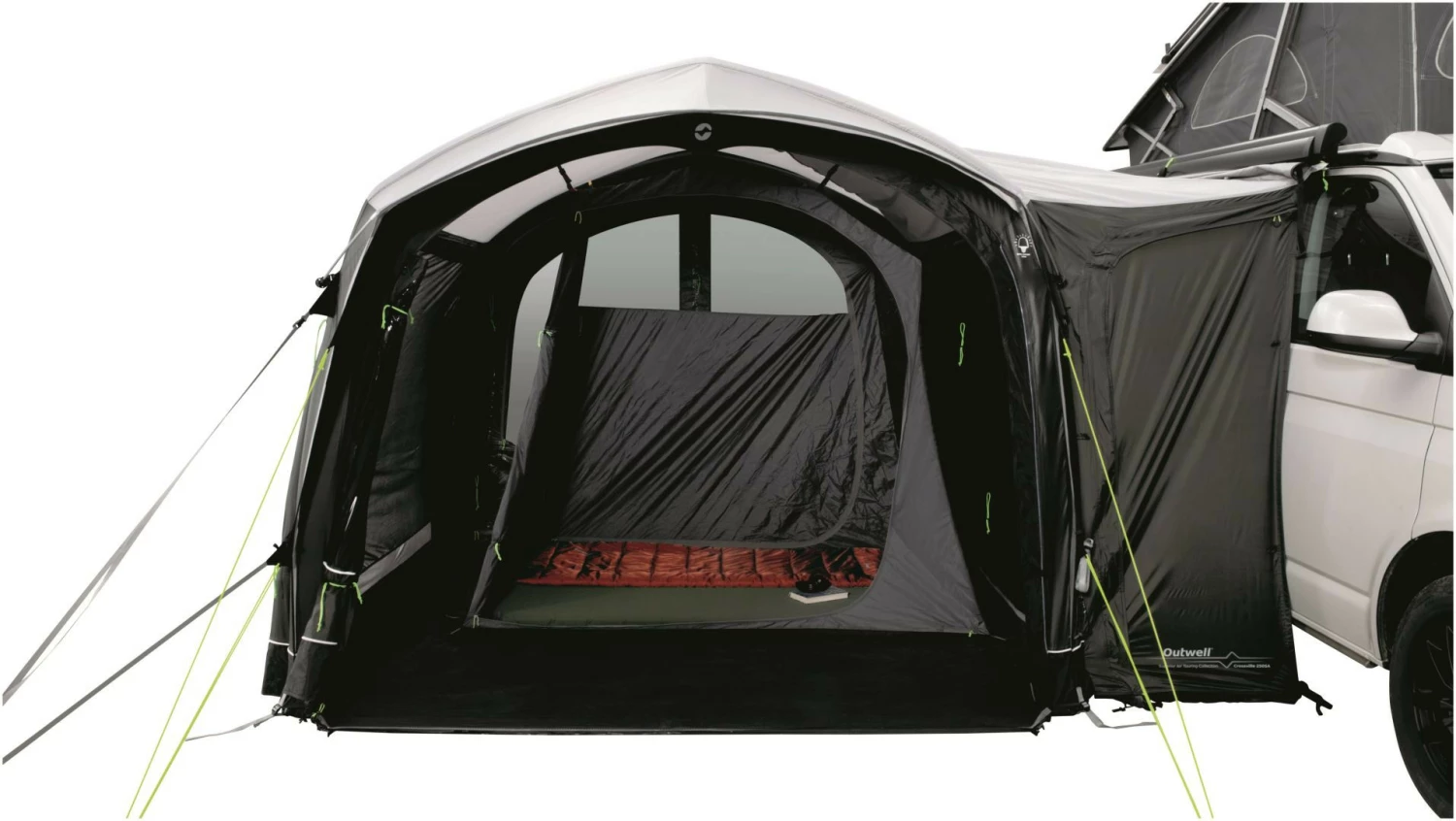 Offering welcome extra recreational and sleeping space, couples and young families will love the sleek design, air tube stability and practical versatility of the Outwell Crossville 250SA compact, parallel-mounted, drive-away vehicle awning. Rainsafe canopies over both front and rear doors offer easy access plus plenty of protected ventilation even in bad weather.