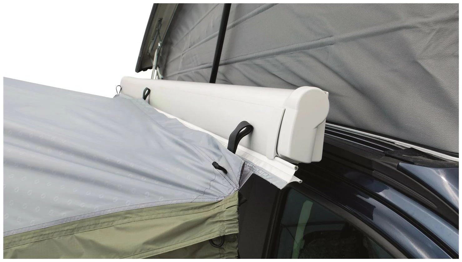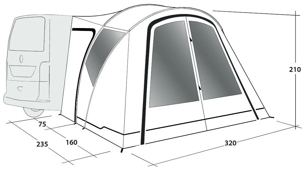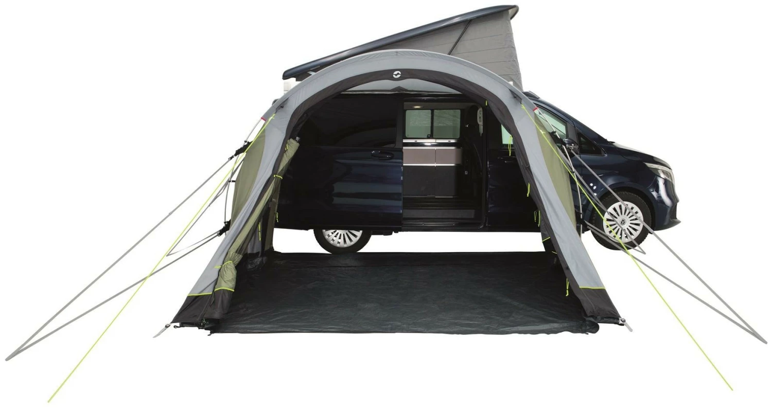 Das freistehende Outwell Busvorzelt Lakecrest ist leicht und kompakt. Das gut zu lüftende Vorzelt hat neben den zwei seitlichen Netzfenstern, ein weiteres Netzfenster und ein getöntes Folienfenster in der breiten Vordertür. Alle Fenster lassen sich mit einem innenliegenden Zip-Up-Vorhang verschließen. Der einfache Aufbau gelingt schnell durch die zwei leichte Aluminium-Gestängebögen. Wird die Frontwand vollständig eingerollt und der hochgezogene Zeltboden entfernt, kann es auch als großzügiges Vordach verwendet werden. Im Schleusenbereich befinden sich zwei gegenüberliegend Eingänge, die auch bei schlechtem Wetter einen guten Zugang zum Fahrzeug oder Zelt ermöglichen. Durch die im Lieferumfang enthaltene Bodenplane für den Schleusenbereich und die komplett öffenbare Rückwand, kann der Innenraum vergrößert und ideal genutzt werden.