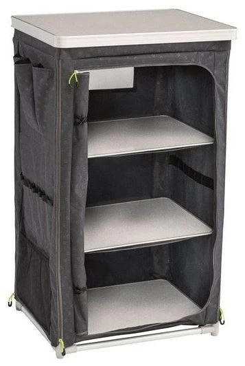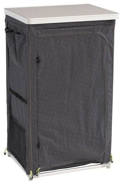 Sekundenschneller Auf- und Abbau. Inneres Rahmensystem für optimales Verhältnis von Fassungsvermögen zu Packmaß. Schrank mit drei Böden, Tür mit Reißverschluss und Lüftungsöffnung aus Netzstoff. Zusammenrollbare Tür für permanenten Zugang. Drei Obertaschen an beiden Seiten des Schranks für kleine Gegenstände wie Schlüssel und Mobiltelefon. Schlaufenleisten an beiden Seiten des Schranks zum Aufhängen kleiner Habseligkeiten. Große Tasche aus Netzstoff an der Unterseite für Schuhe usw. Inklusive Tragetasche für einfache Lagerung und Transport.