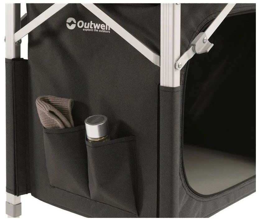 Sekundenschneller Auf- und Abbau. Große Bambusarbeitsfläche. Schrank mit zwei Böden, Tür mit Reißverschluss und Lüftungsöffnung aus Netzstoff. Vier Taschen an der Seite des Schranks. Griff zum einfachen Tragen im zusammengeklappten Zustand. Inklusive Tragetasche für einfache Lagerung und Transport.