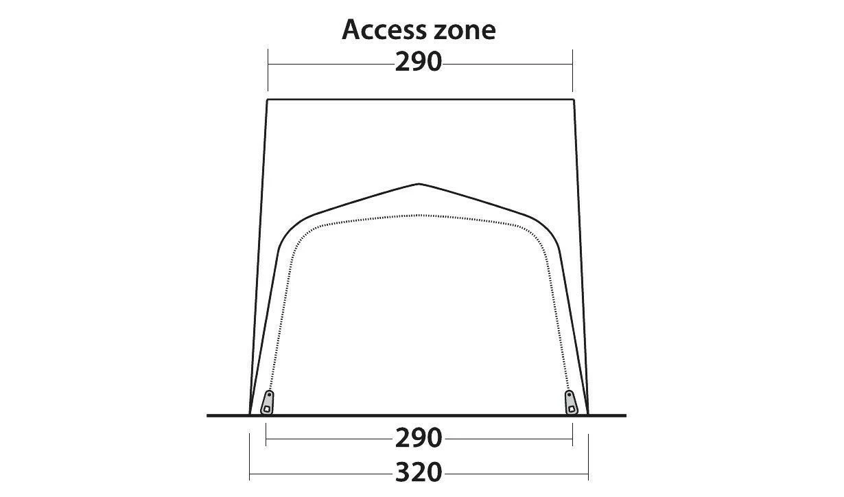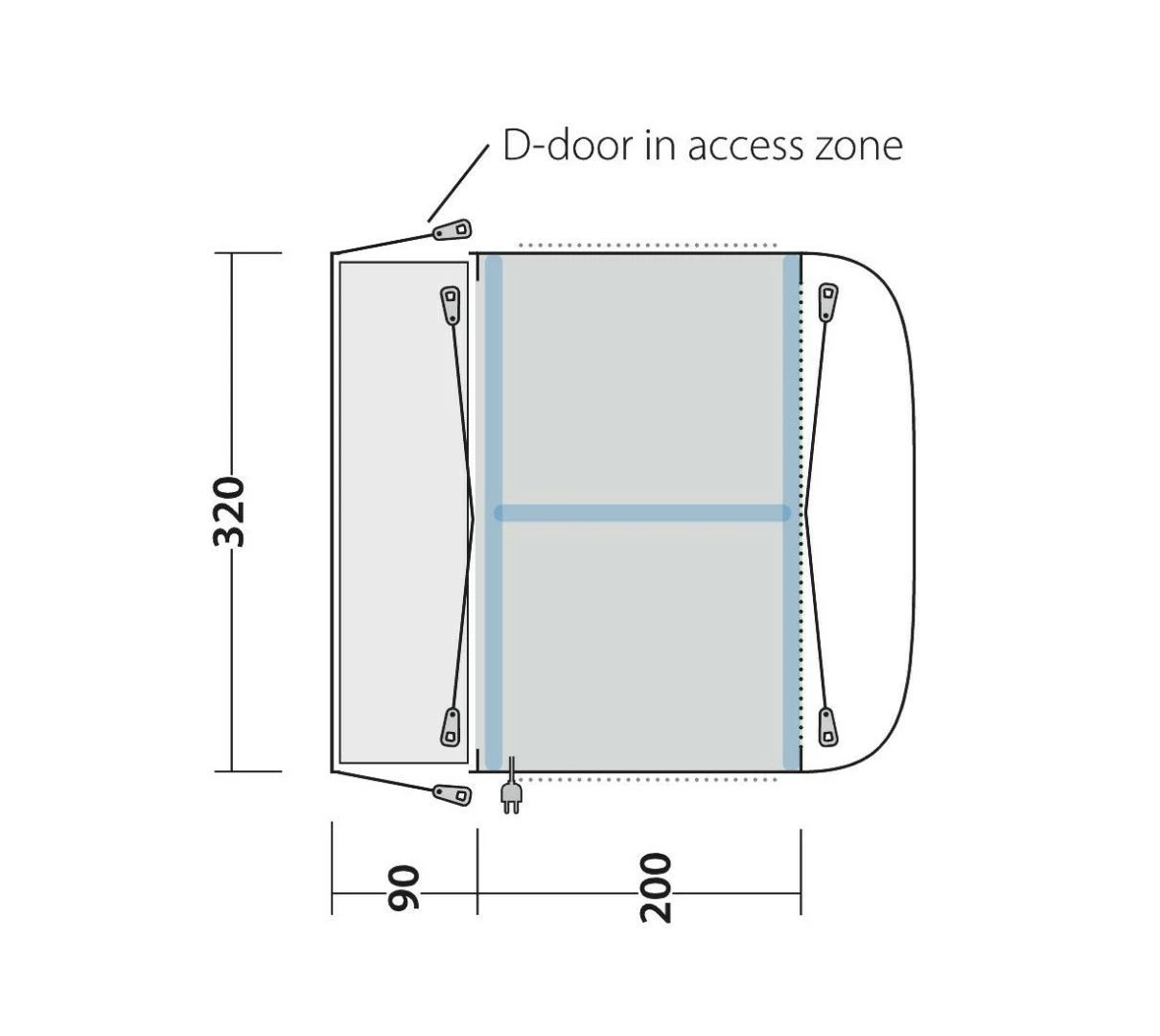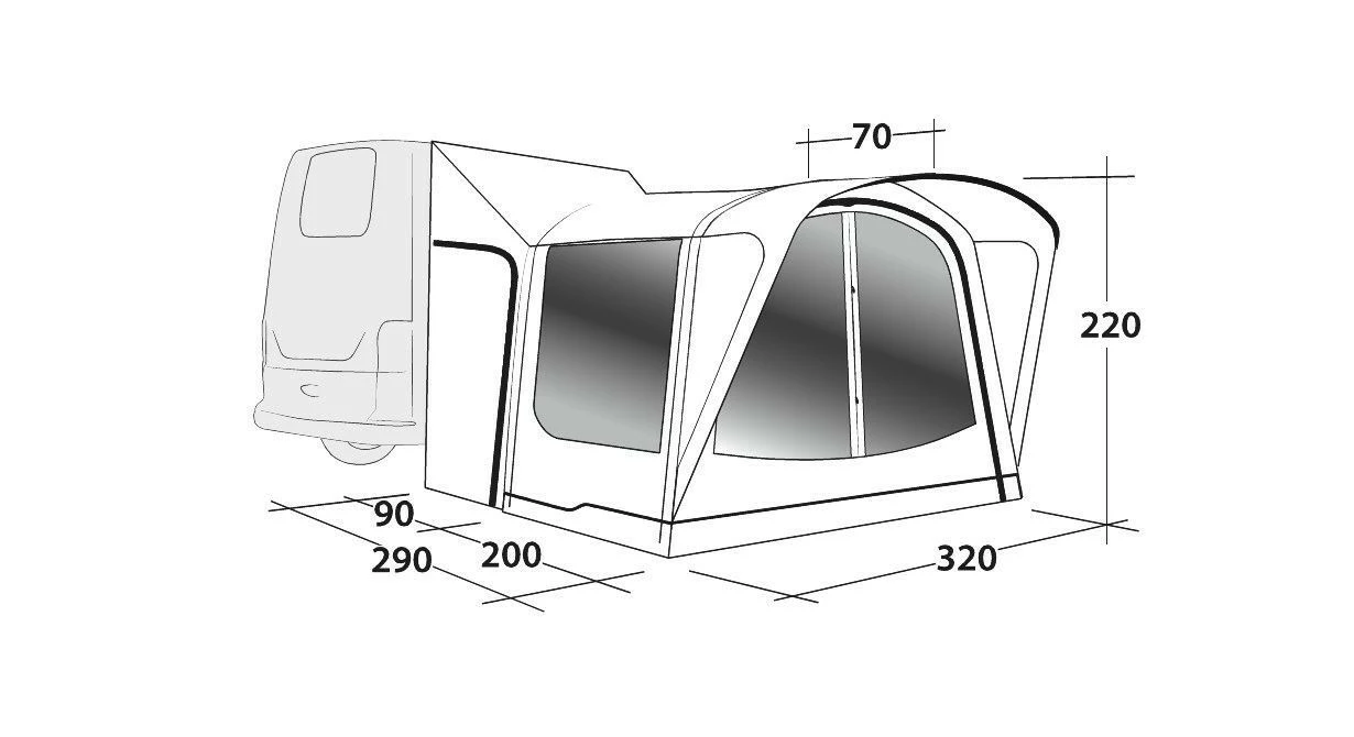 Für Reisemobile mit einer Anschlusshöhe von 270-300cm schafft das aufblasbare freistehende Parkville 200SA Xtra Tall einen großartigen lichtdurchfluteten Raum. Die Verbindungsschleuse kann entweder mit dem Doppelkeder in die vorhandene Markise befestigt werden oder man nützt die langen Leinen und spannt die Schleuse über das Dach des Fahrzeuges. Die mit Moskitonetz ausgestattete Frontwand mit Fenstern wird von einem Vordach geschützt und kann mit vier Reißverschluss-Schiebern vollständig geöffnet werden, um einen Verandabereich zu schaffen. Zudem befinden sich in der Verbindungsschleuse zwei weitere Eingänge. Für diesen Bereich ist eine zusätzliche Bodenplane inklusive Schürze beinhaltet, was die Schleuse als verlängerten Innenraum sinnvoll nutzbar macht.