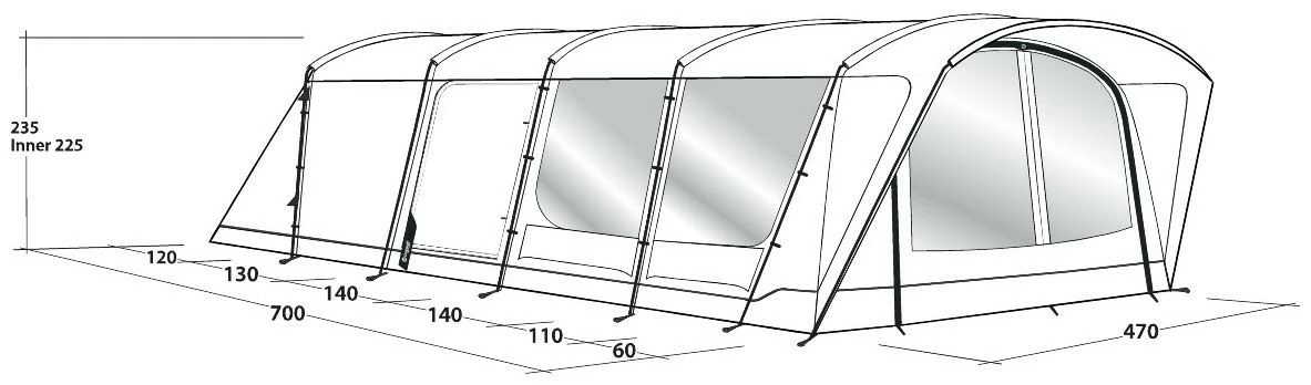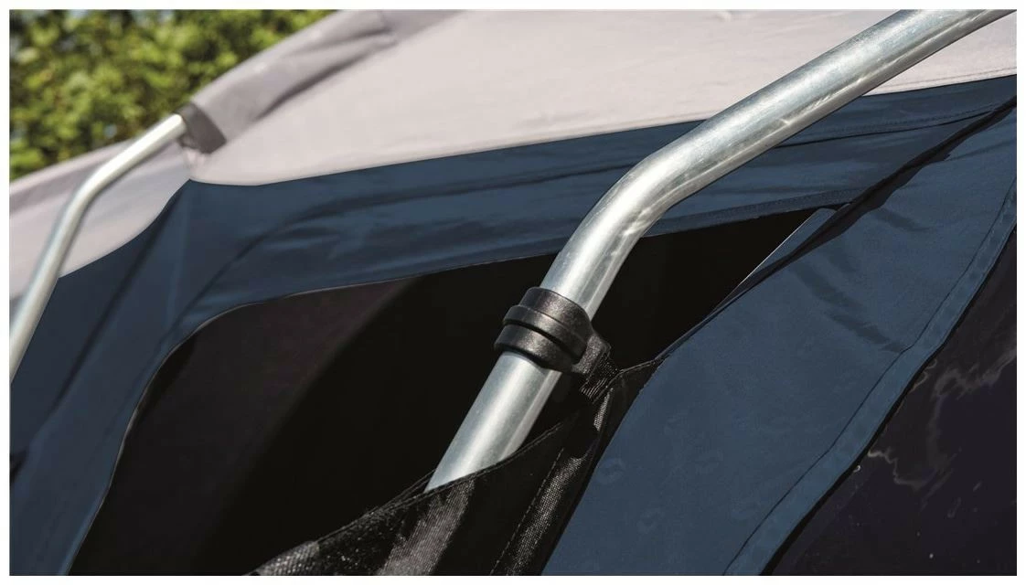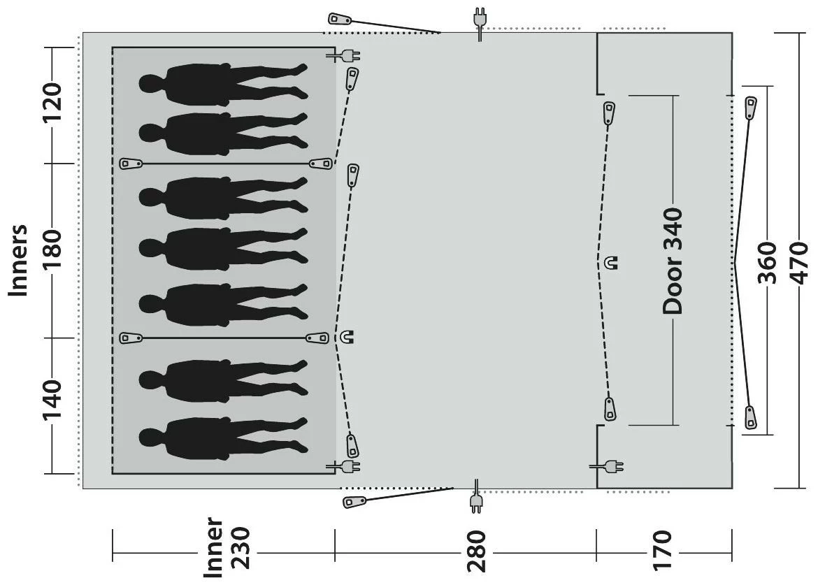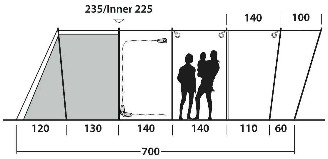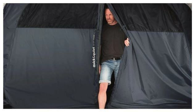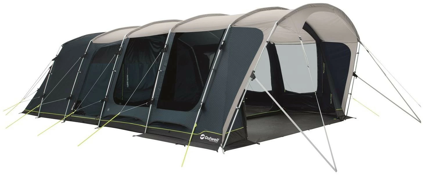Das lichtdurchflutete Vermont 7PE bietet sieben Personen reichlich Platz in drei Master-Schlafkabinen vom Typ Ambassador, die mit abgedunkelten Innenzelten und den Quick & Quiet Inner Doors ausgestattet sind. Der steile Vordereingang befindet sich unter dem erweiterten Vorraum und bietet in Kombination mit den beiden D-förmigen Türen mit Netzeinsatz flexible Zugangs- und Belüftungsoptionen. Vorgebogene Stangen sorgen für eine erstklassige Stabilität, während die steilen Seitenwände den nutzbaren Innenraum maximieren und volle Kopffreiheit gewährleisten. Viele Ausstattungsmerkmale garantieren einen so hohen Komfort, dass sich die Zeltbewohner wie zu Hause fühlen können. Dazu gehören der Quick & Quiet Access zu Zone 2, das Outwell HookTrack System, das Easy Pegging System, die Kabeldurchführung, die Vorhänge mit Reißverschluss, das Rear Ventilation System und die niedrig angeordneten, seitlichen Lüftungsöffnungen.