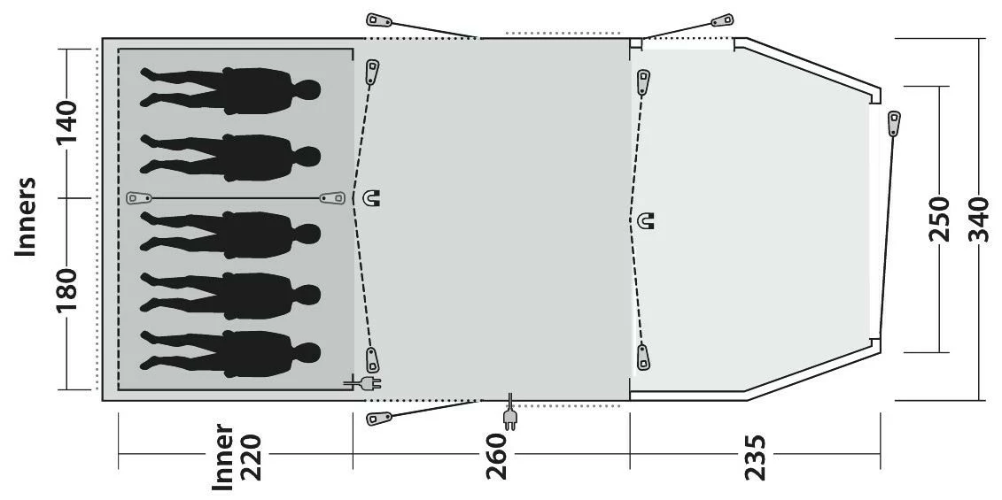 The three-zone layout has a side door in the wet zone area for easy access; roll away the front door to connect with nature. Along with two doors in the living area, you benefit from truly flexible access and functionality. Sleeping five in two large bedrooms, this is a luxurious tent with plenty of room for many happy holidays with family and friends.