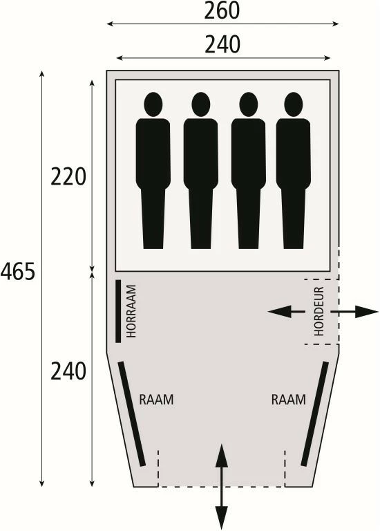 Das Zelt besteht aus einer Schlafkabine und einem Wohnraum. Der Wohnraum hat einen Seiteneingang mit einer Moskitonetztür. Darüber hinaus verfügt das Zelt über abschließbare Fenster und ein permanentes Belüftungssystem für einen kühlen Schlaf. Ein PE Groundsheet wurde vorne platziert.