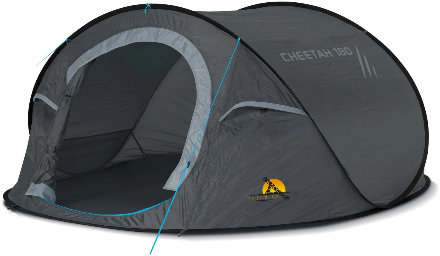 De Safarica Cheetah 180 is een 2-3 persoons enkeldaks pop up tent met hordeur. Buitentent is van polyester met een PU coating, waterkolom 3000 mm. Getapete naden. Extra lange slaapcabine (240 cm). Opbergvakken in binnentent.