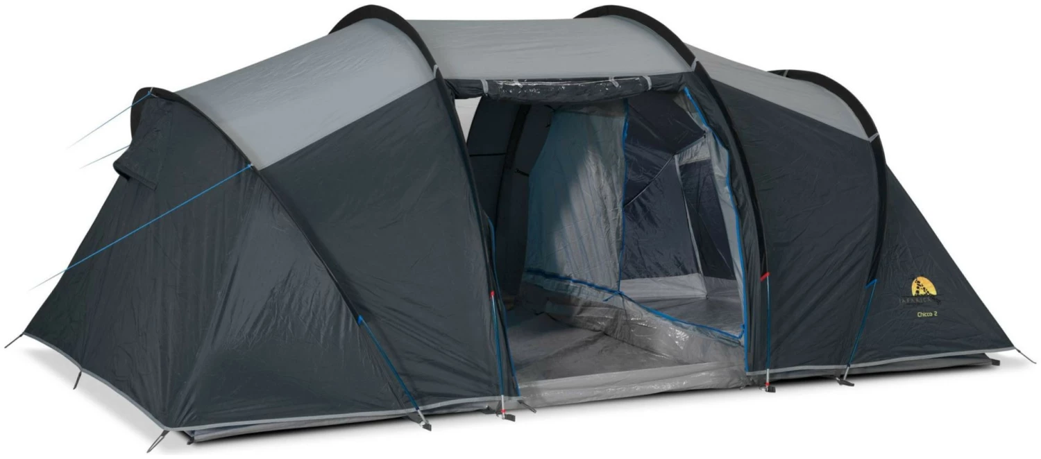 Das Safarica Chicco 2 ist ein 2-Personen-Zusatzzelt aus Polyester mit zwei separaten Schlafkabinen (gegenüber). Das Außenzelt besteht aus Polyester mit Klebebandnähten und einer Wassersäule von 4000 mm. Das Zelt hat ein PE-Groundsheet im Wohnbereich. Das Zelt verfügt über ein permanentes Belüftungssystem. Die Fenster können mit einem Vorhang geschlossen werden. Der Chicco hat Glasfaserstangen.